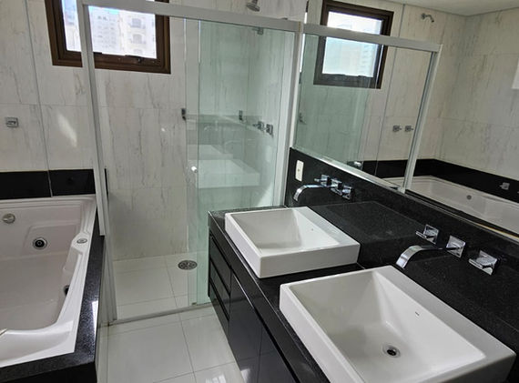 Apto reformado com 4 salas, escritório com armários e mesa, 3 suítes, sendo a principal com walk- in closet e amplo banheiro com jacuzzi. Sala de estar, sala de jantar com mesa e 10 cadeiras e vidro top protetor fumê lindíssimo; cozinha com eletrodomésticos moderníssimos, fogão com coifa, e espaçosa área de serviço com dependência de empregada. Repleto de armários feito sob medida, camas com painéis e criados mudos; sala de ginástica no próprio apto; ar-condicionado frio e quente em todos os cômodos, inclusive na Cozinha, 2 elevadores sociais privativos e um grande de serviço. São 4 vagas.